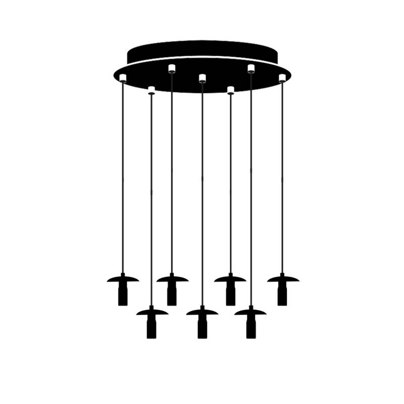 Con questa plafoniera metallica e i suoi 7 cavi tessili paralleli, si possono creare punti luce componibili e moderni.