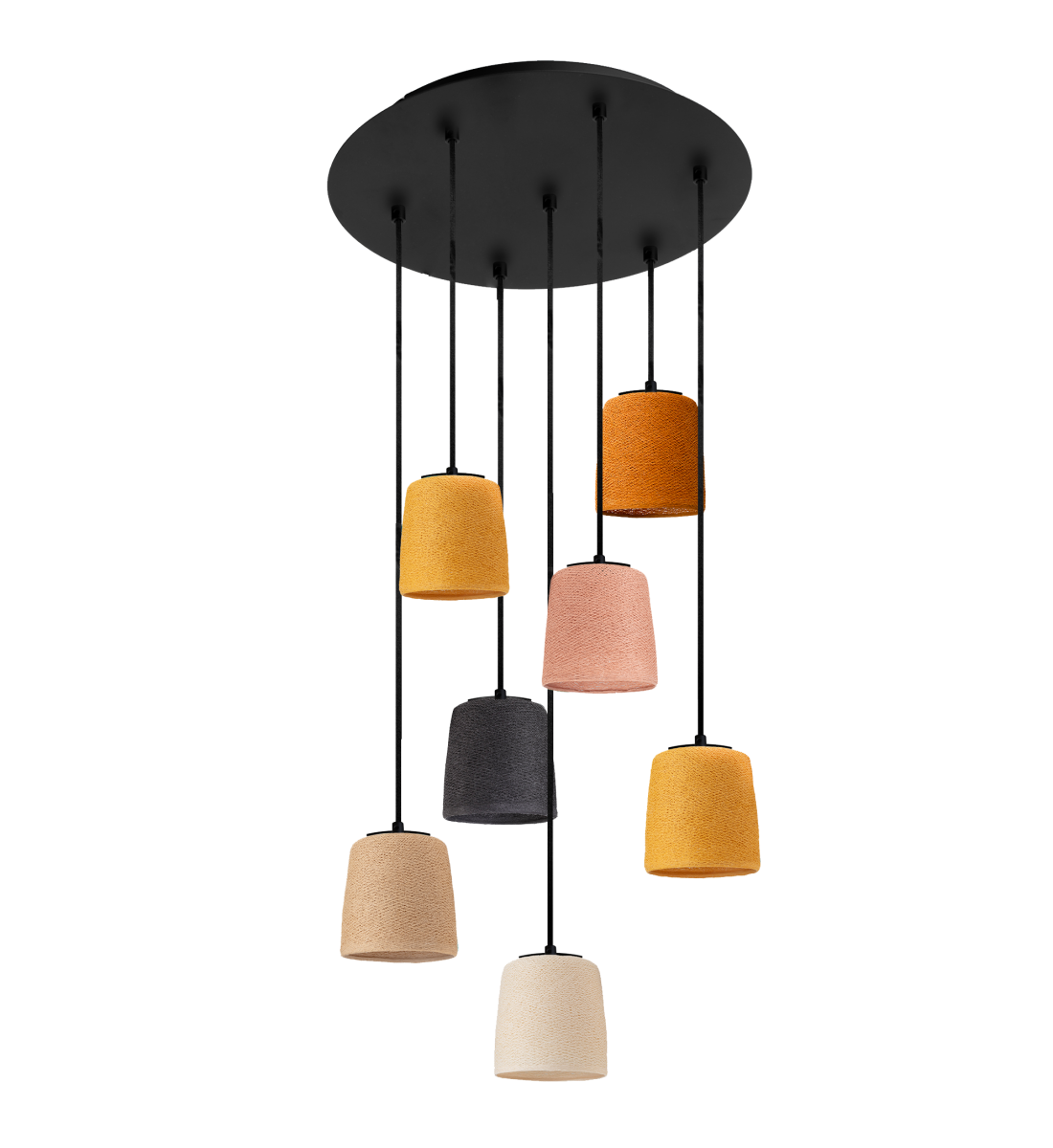 - 7 Swing-Lampenschirme (ø12cm) handgewebt, mit einer Metallscheibe an jedem Kabel, um die magnetischen Lampenschirme aufzunehmen.
